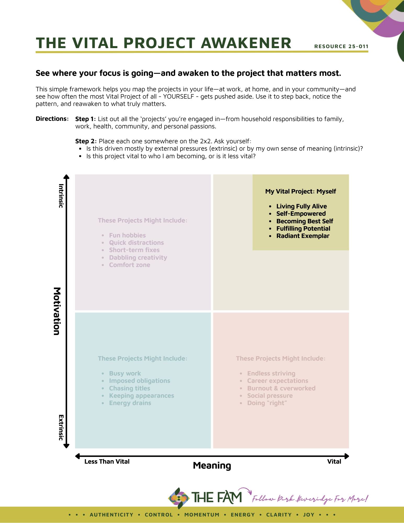 This simple reflection tool is designed to help you step back, map the projects that fill your days, and reawaken to the one that matters most—yourself. Download this tool to see where your focus is and awaken to the project that matters most, your Vital Project.
